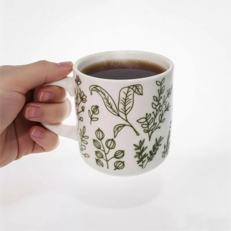 1. Cette tasse présente un imprimé botanique vert simple et naturel comme pièce maîtresse visuelle :