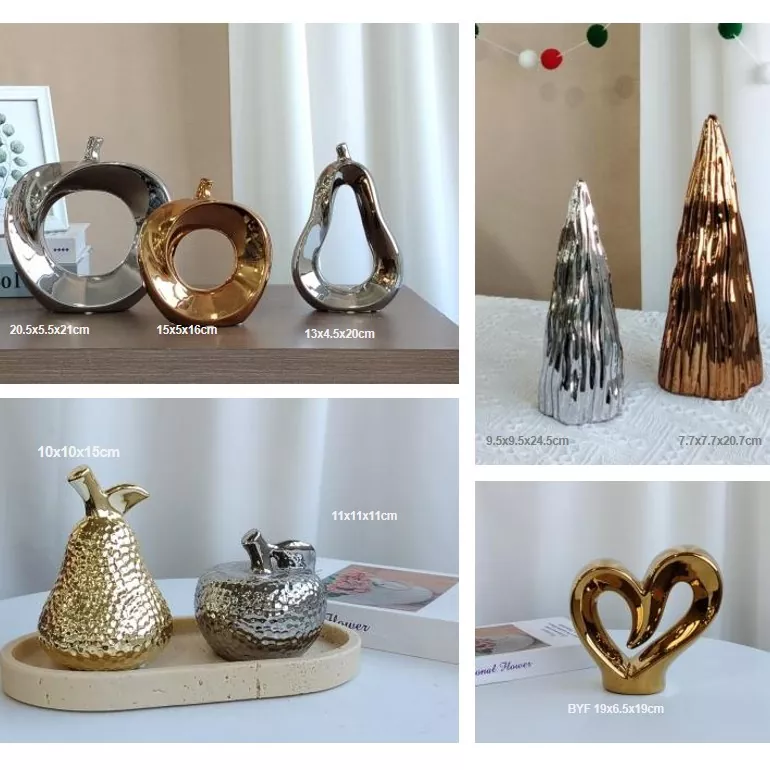 Les décors en céramique spéciaux de BYF présentent des fruits, des arbres de Noël et des cœurs. Fabriqués en céramique, ils utilisent une technique unique pour créer un éclat métallique, disponible en or et en argent. Les conceptions de fruits (pomme et poire) présentent des lignes lisses, avec des découpes et des textures uniques; L'arbre de Noël est tridimensionnel, avec des textures riches; Et le cœur est simple et élégant, prêtant une touche de romance. Ces pièces élégantes et luxueuses sont parfaites pour votre salon ou votre table, ajoutant une touche de flair et de style artistiques à votre maison. Ce sont des accessoires raffinés qui améliorent l'ambiance de tout espace.