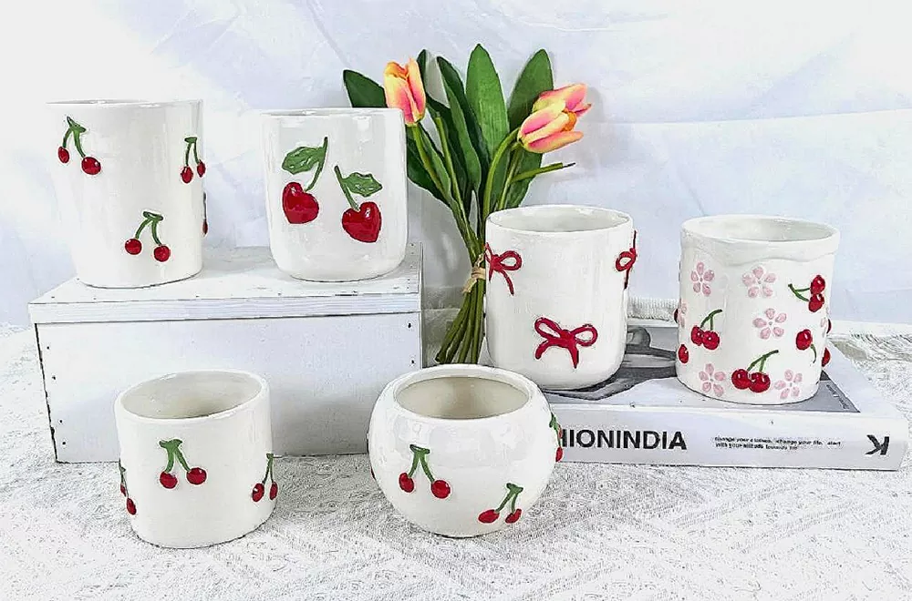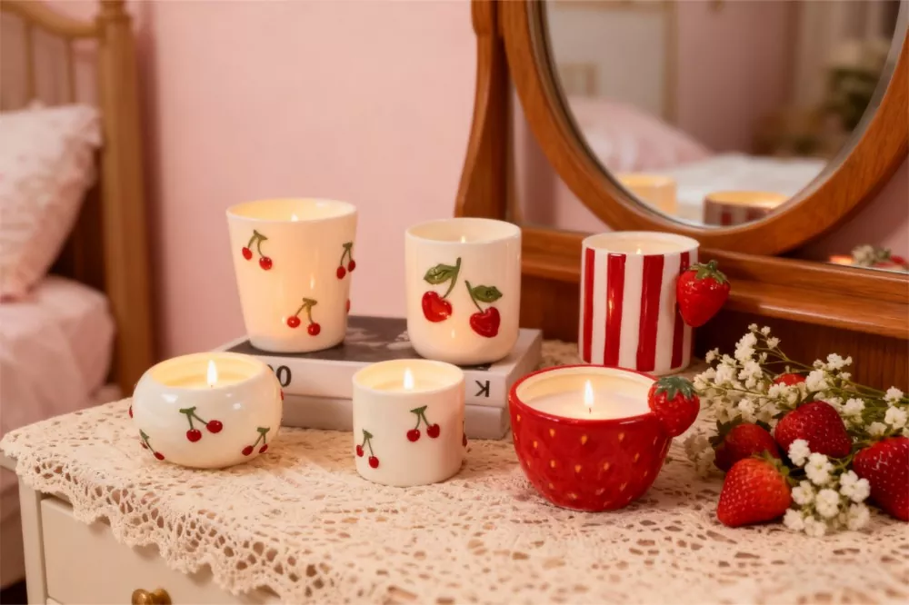 Le motif de cerise rouge vif et de feuille verte transmet une atmosphère douce, classique et joyeuse. La poignée tridimensionnelle unique en forme de fraise et le design du pot ajoutent une sensation tactile vivante, stimulant un fort désir chez les clients de le posséder. D'élégants nœuds papillon rouges ou roses ornent le design, donnant au produit une qualité de cadeau raffinée et un style romantique. Fabriqué à partir de céramique artisanale de haute qualité, le vernis est chaud et lisse, mettant en valeur une texture mate haut de gamme. Il possède une excellente résistance à la chaleur et une excellente stabilité, garantissant une combustion sûre, et est parfaitement compatible avec les bases de cire courantes telles que la cire de soja et la cire d'abeille.